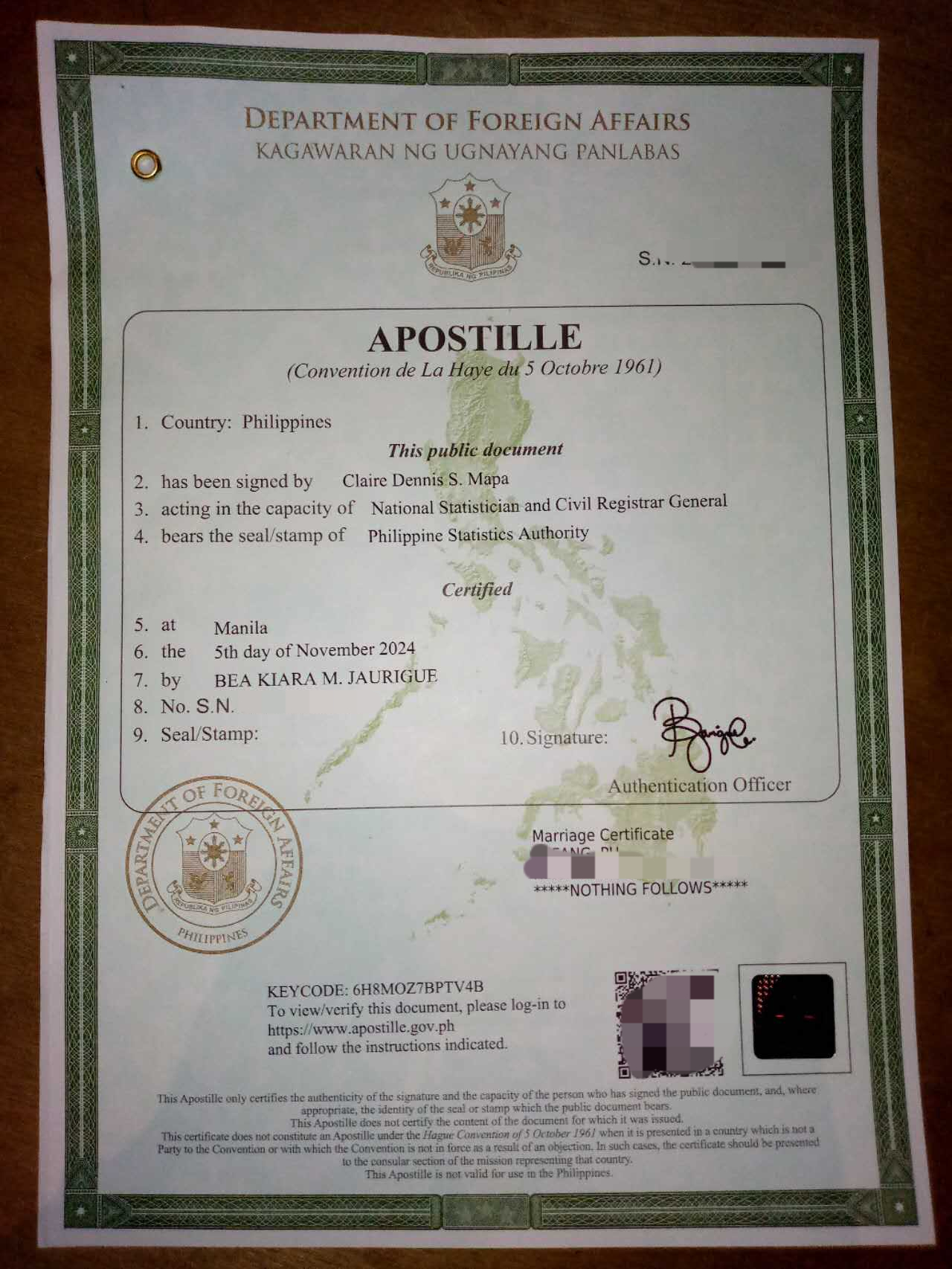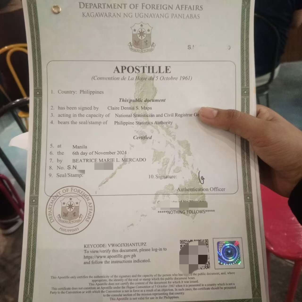 之前9月份已经办了降签了,现在签证就到这个月19号这个就到期了,中间办我老婆的中国签证、出境的手续、还有我们的结婚证海牙认证后面办我的ECC手续,总体其实挺赶的,但还好前几天我的ECC也给我们出了,我前天也已经顺利带着我老婆回国了没被拦,也是听说了很多菲律宾人出境会被海关拦幸好我们提前问了华商需要准备什么了