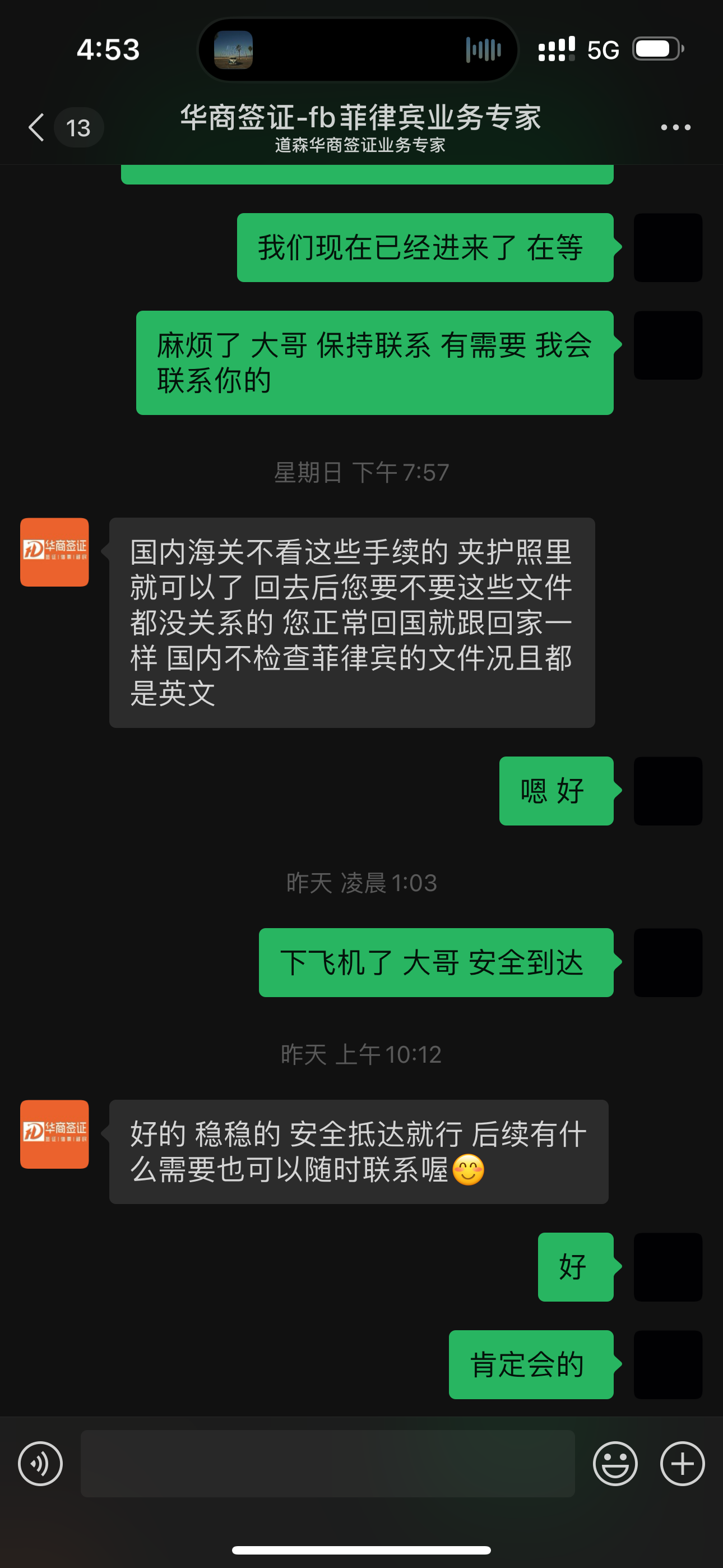 之前找他们办我爸妈的菲律宾旅游签,她想来看我顺便来旅游,然后出了之后又找他们办保关找华商方便,因为华商会给你出酒店订单和回程订单还帮你天入境码好入关一点,不然两个老人怎么弄,现在我妈刚回国半个月又想来没办法只能又找华商给她再办理一次了