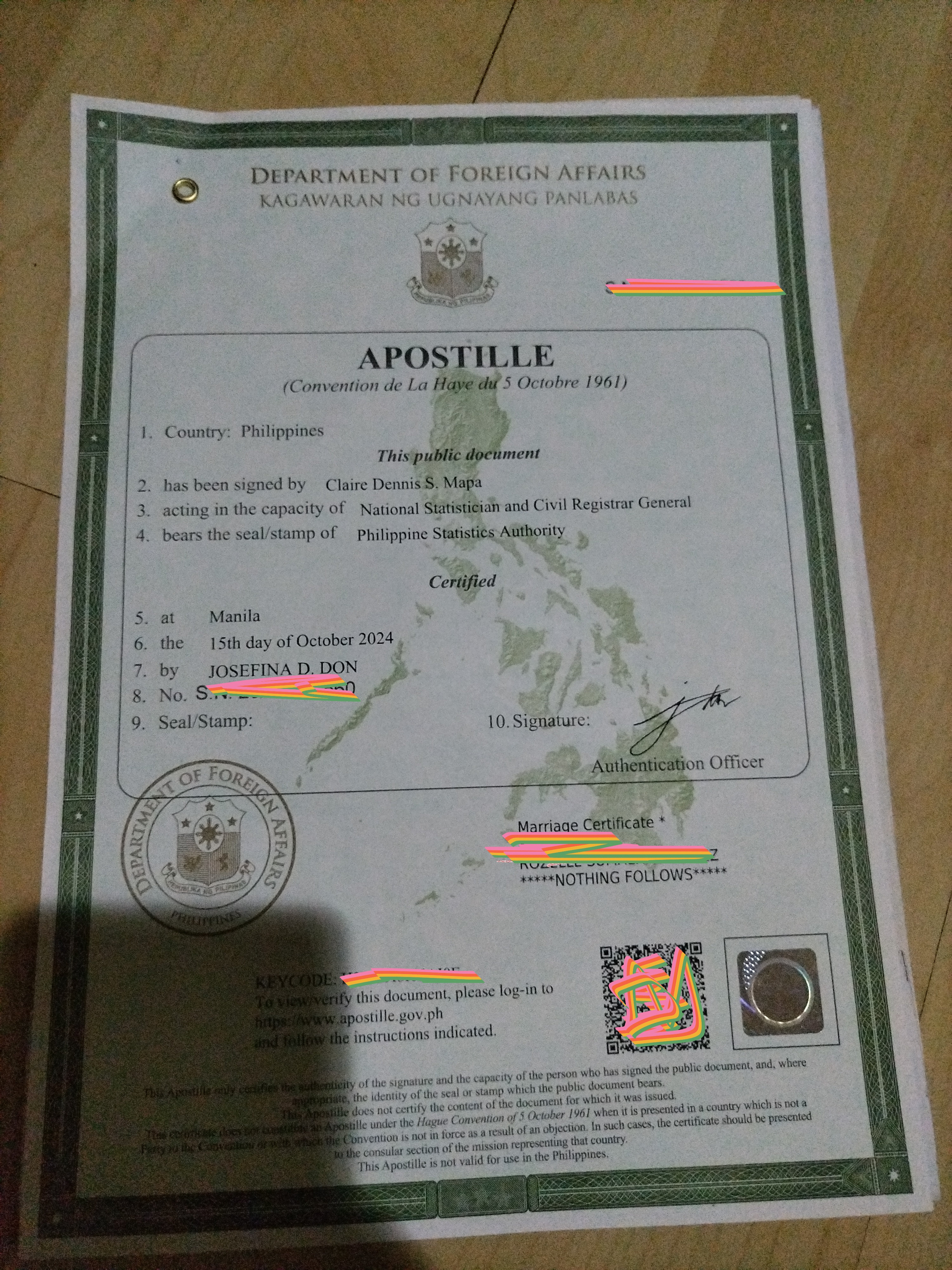 今天他们的小菲带我老婆去DFA做完没结婚证的海牙认证了,因为我们着急出下个月20号这样就打算回国了探亲签这些后再华商这办好了,就等这个认证办了之后我们在国内方便一点做居留证之类的,小菲带我老婆去就能出快一点,上星期台风DAF停工了几天排队好多人,华商很耐心的处理我们的事情