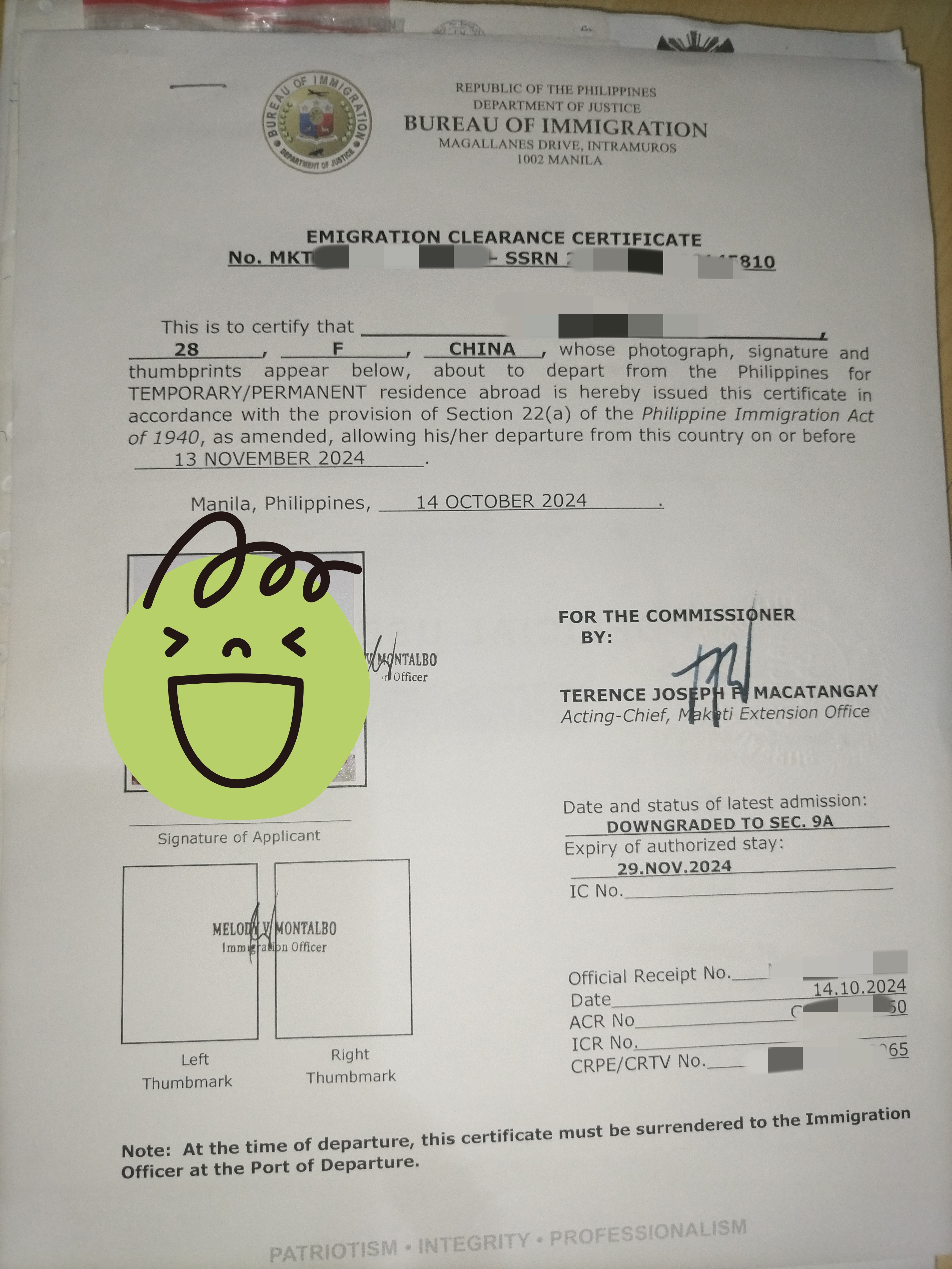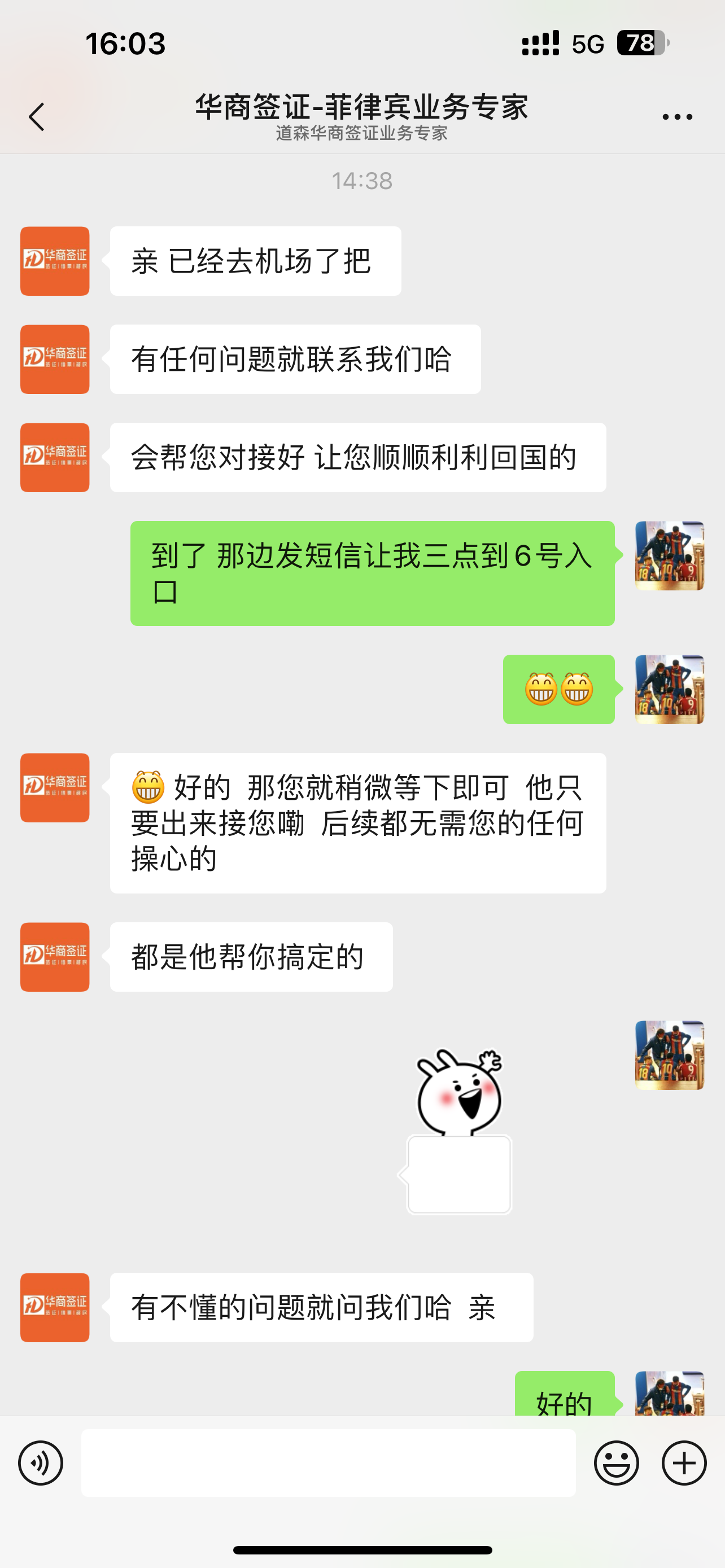 国内有急事着急回来,机票都买了,就缺一个ECC清关的的文件了,找到华商之后说可以加急,但找他们的时候有点太晚了只能第二天去按指纹,然后他们的客服和我一起协调改签改航班,得多停留一晚他们小菲帮我找个酒店,因为打算回国了都没披索了,我打车过去送证件,跟华商换了钱才付的车钱和酒店钱,给我安排一大早就去按指纹,一个小时就拿到证了,然后我就去机场了当天晚上我就到国内了,真的很感谢华商短短不到两天证帮了我超级多,人都超级好,下次有需要绝对还找他们
