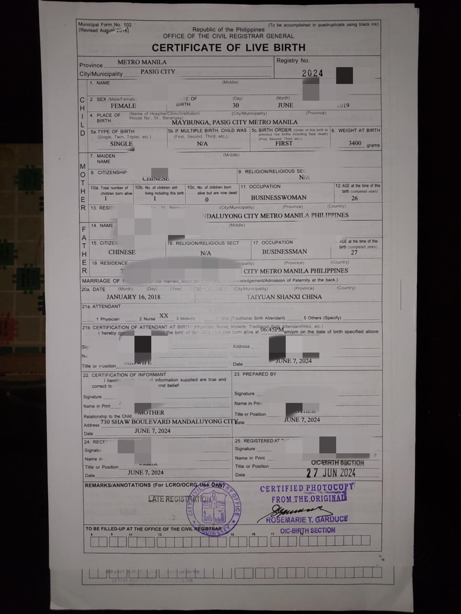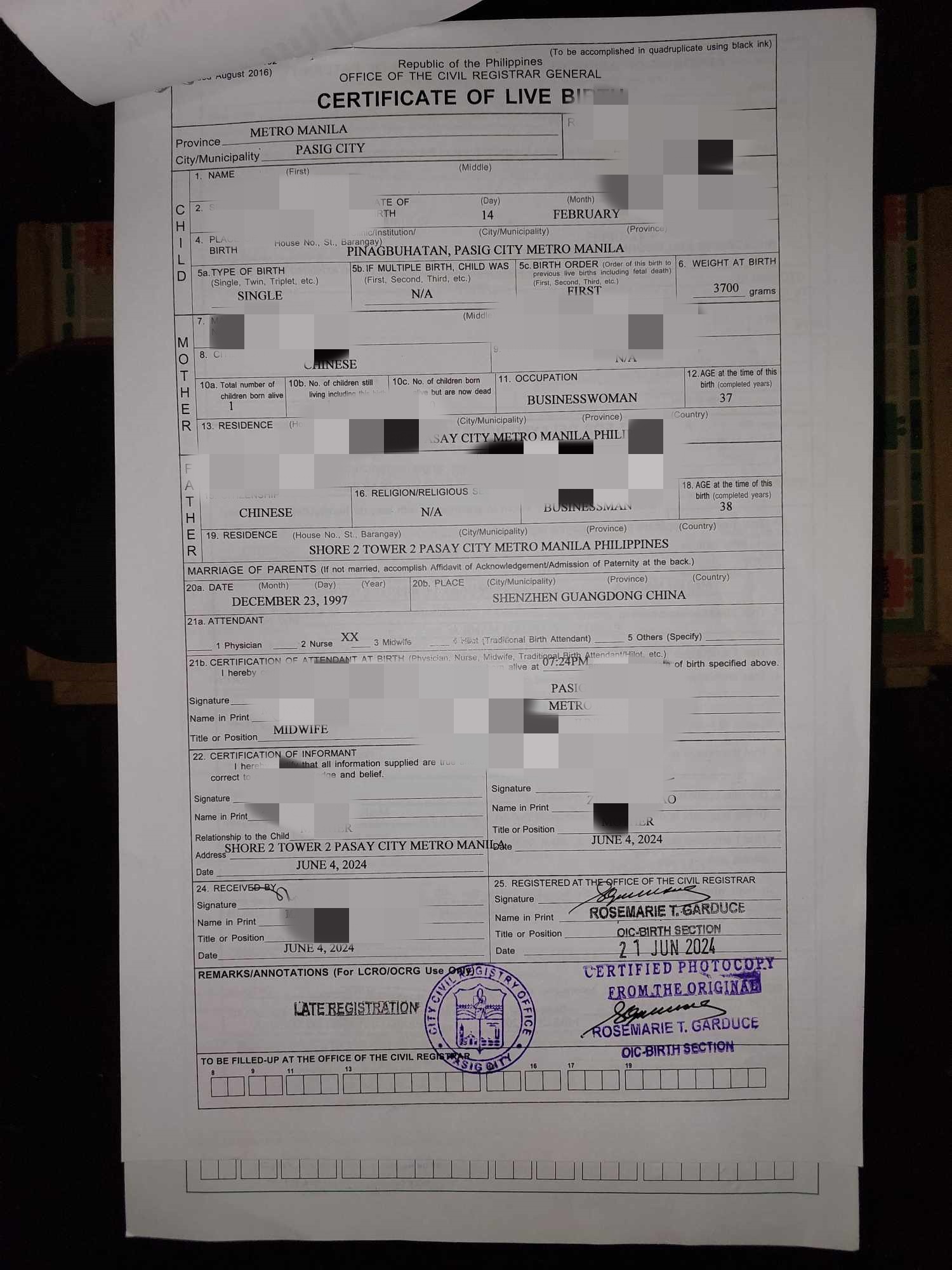 结婚证psa和孩子的无菲籍证明还有孩子的护照还有我老婆的探亲签都在这边做的,现在探亲签就等取证了,孩子护照中途使馆要求补资料补结婚证PSA和无菲籍证明,这些我们原本没有就找华商办的,等这些证件耽误了几天,现在也快办好了。上门取件办好有叫骑手送过来,珍挺方便的