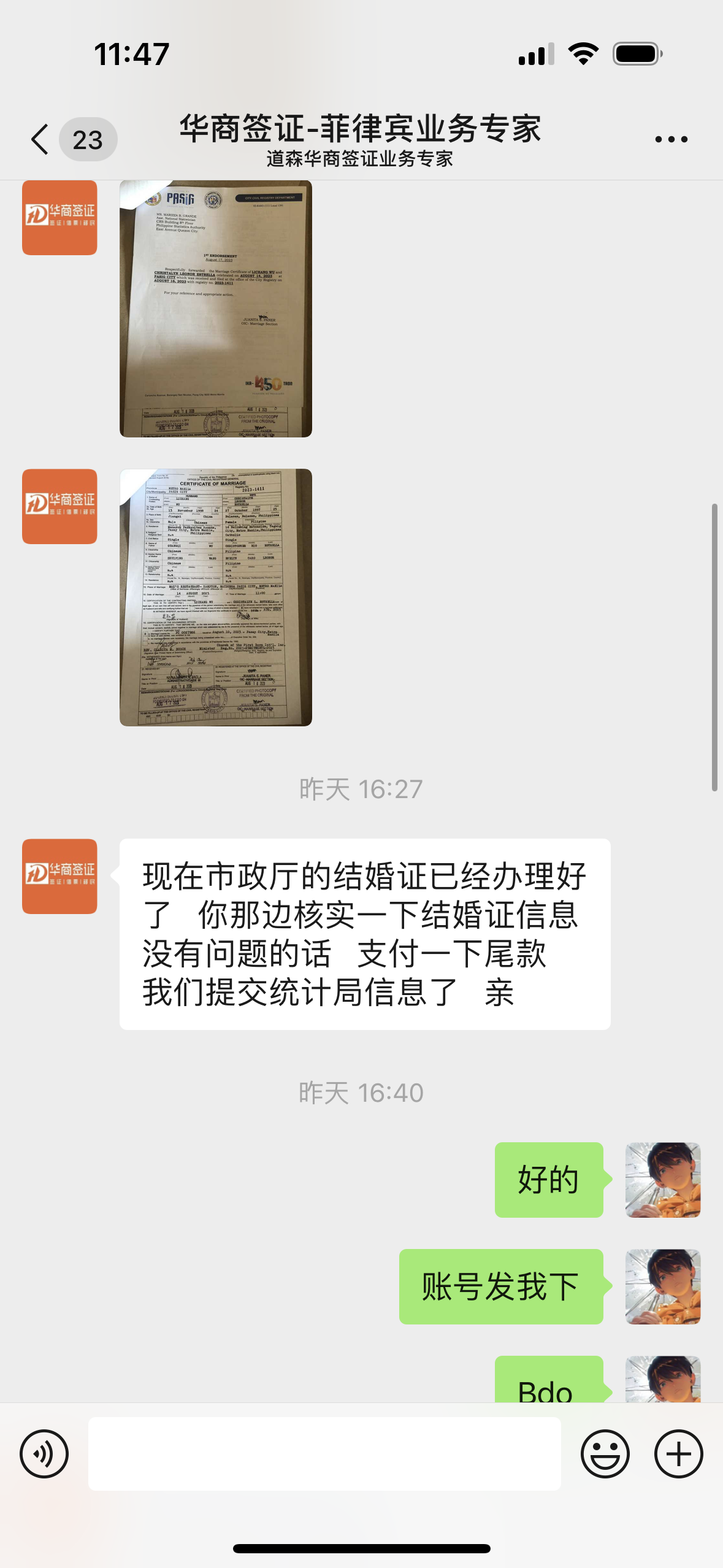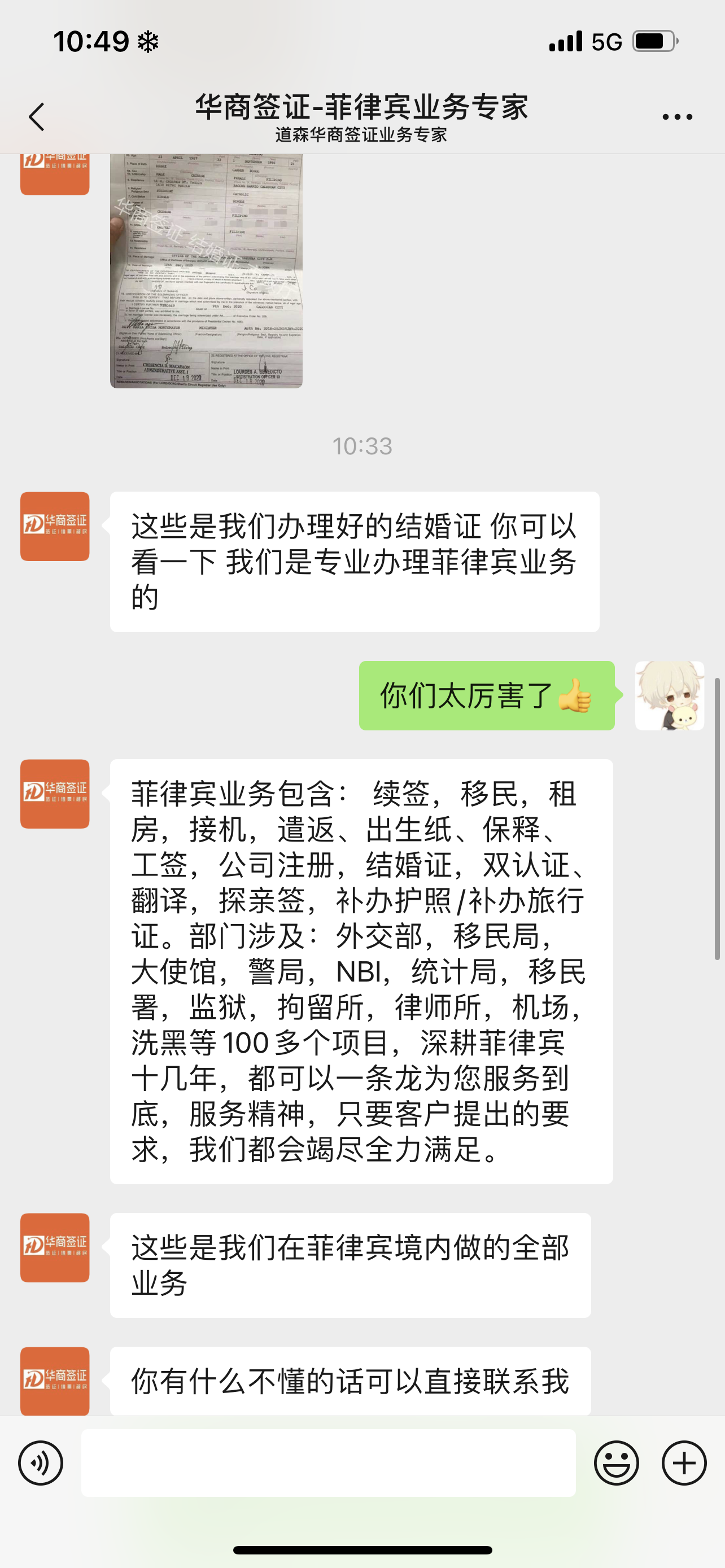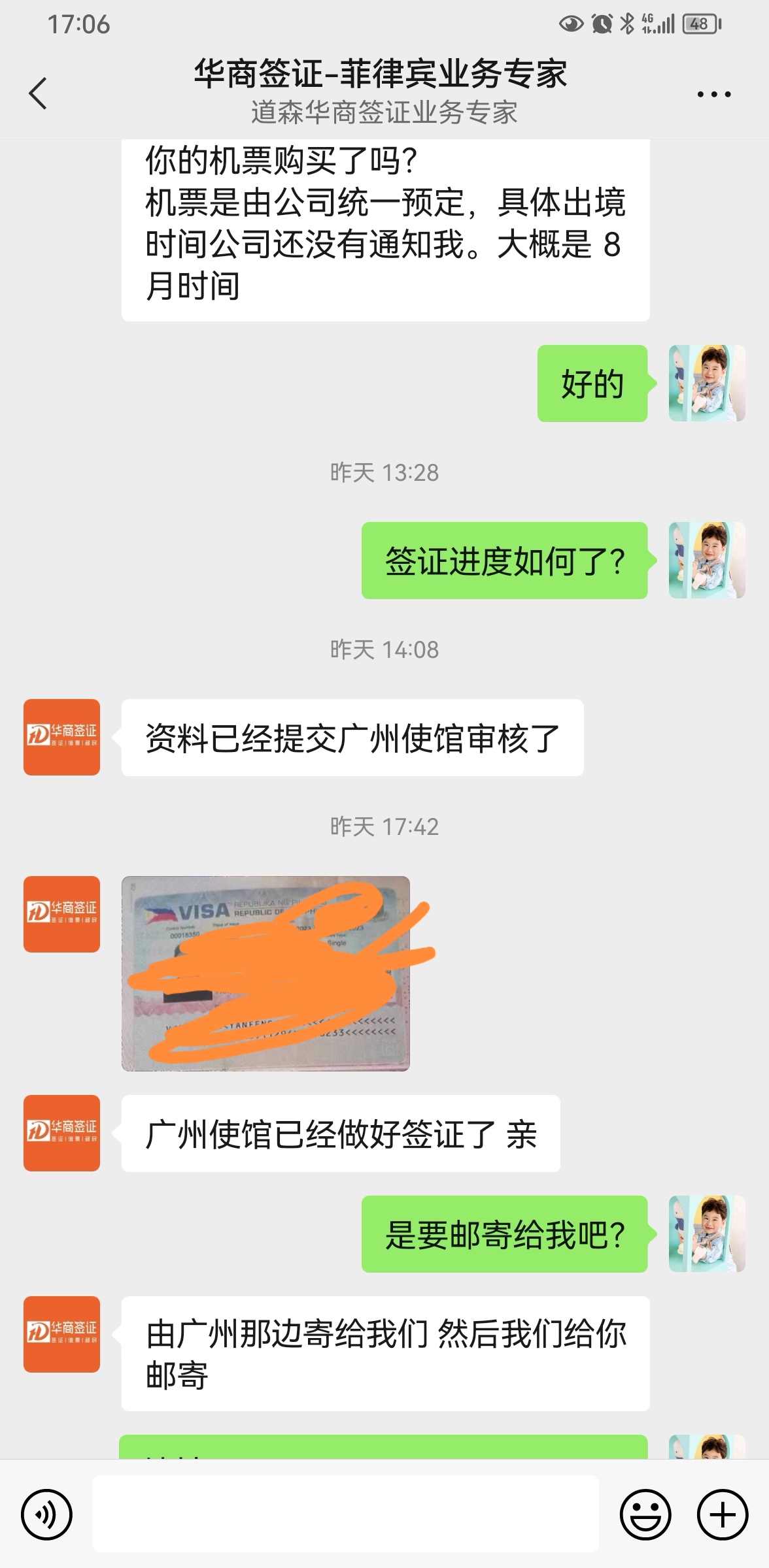 华商签证的客服专业,耐心解答,帮助闺蜜菲律宾女孩顺利来中国,专业靠谱,会一直找华商合作的